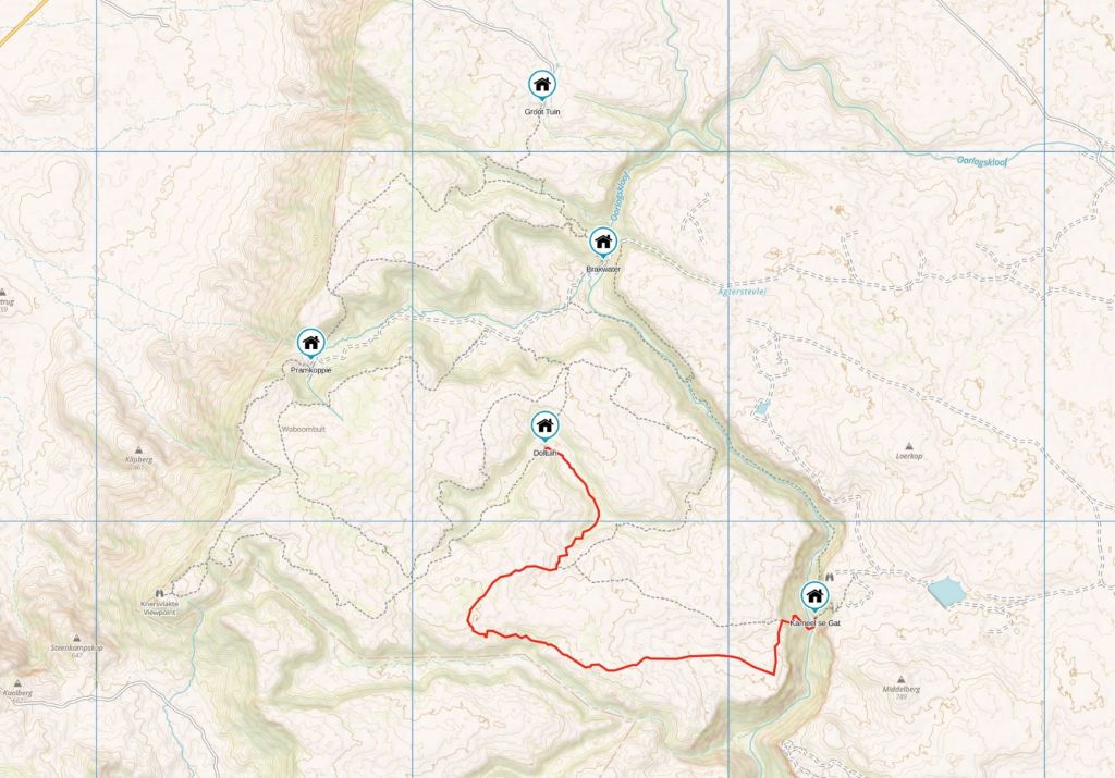 Our hut for the night is called Doltuin Camp. The word ‘Dol’ comes from the Afrikaans for ‘digging up’, a reference to the small patches of cultivated fields where the early farmers established small-scale farms. Today, the areas are extensively invaded by ‘renosterbos’ (Elyptropappus rhinocerotus).