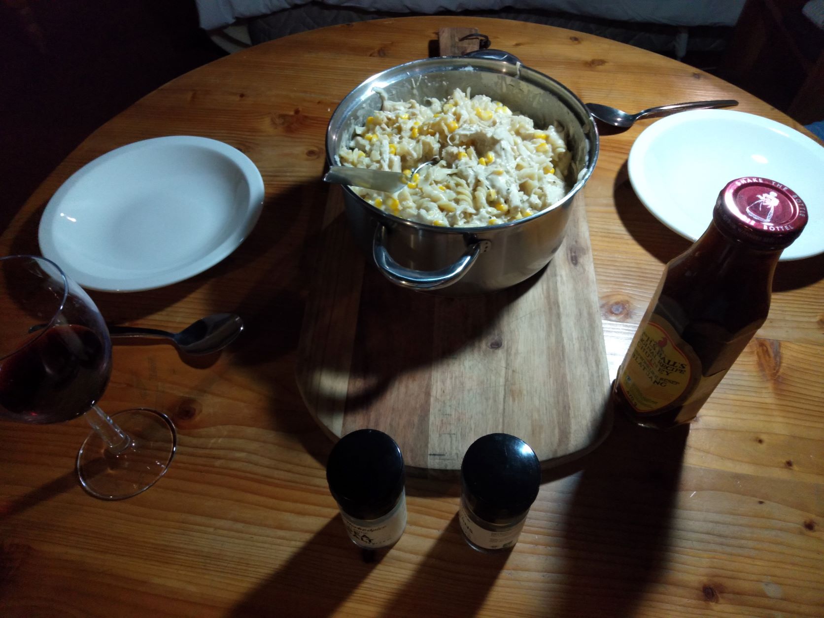 It was time to get back to the hut again – the only dry place at the moment. Berto prepared a tasty chicken pasta dish while we enjoyed a bottle of red wine.