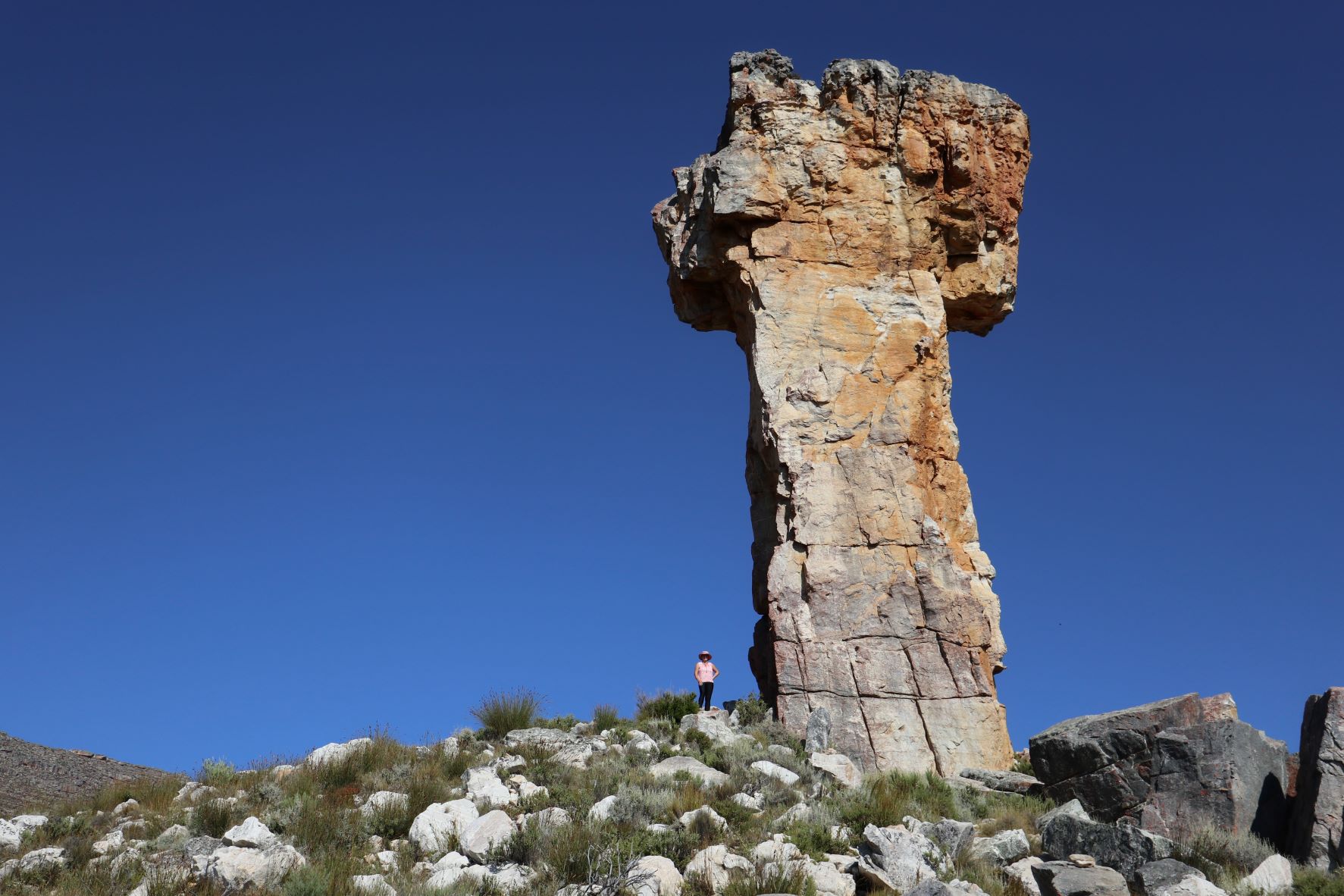 The Maltese Cross stands alone, around 30m high. The rock type is quartzitic Table Mountain sandstone (thereβs even quartz pebbles imbedded in the rock).
