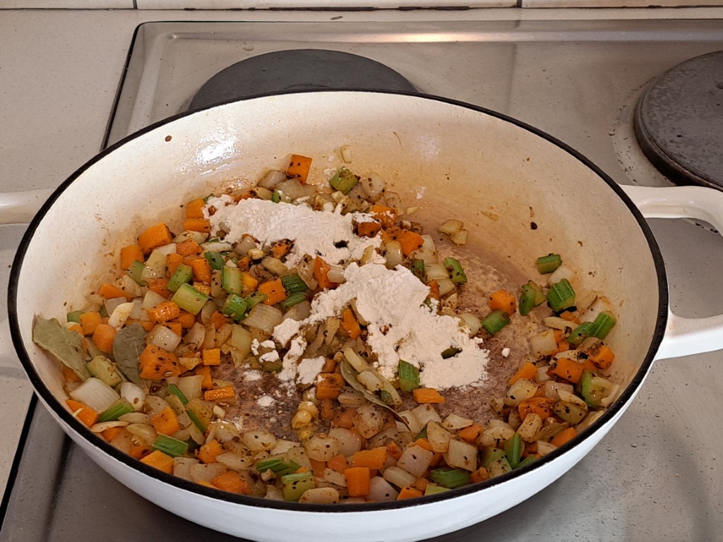 Fry the onion, carrots and celery until soft. Add the garlic and all the other spices and mix well. Then stir in the flour until it disappears.