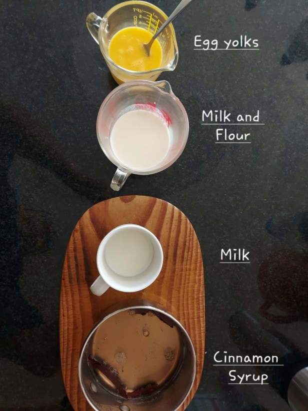 Start making the puff pastry first, as it needs to rest in the fridge for a few hours. The filling (custard) can be made after the prepared puff pastry has been in the fridge for a few hours.