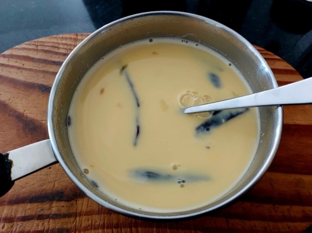- Add the vanilla and stir for a minute. Whisk in the yolks, strain the mixture into a bowl, cover and set aside.
