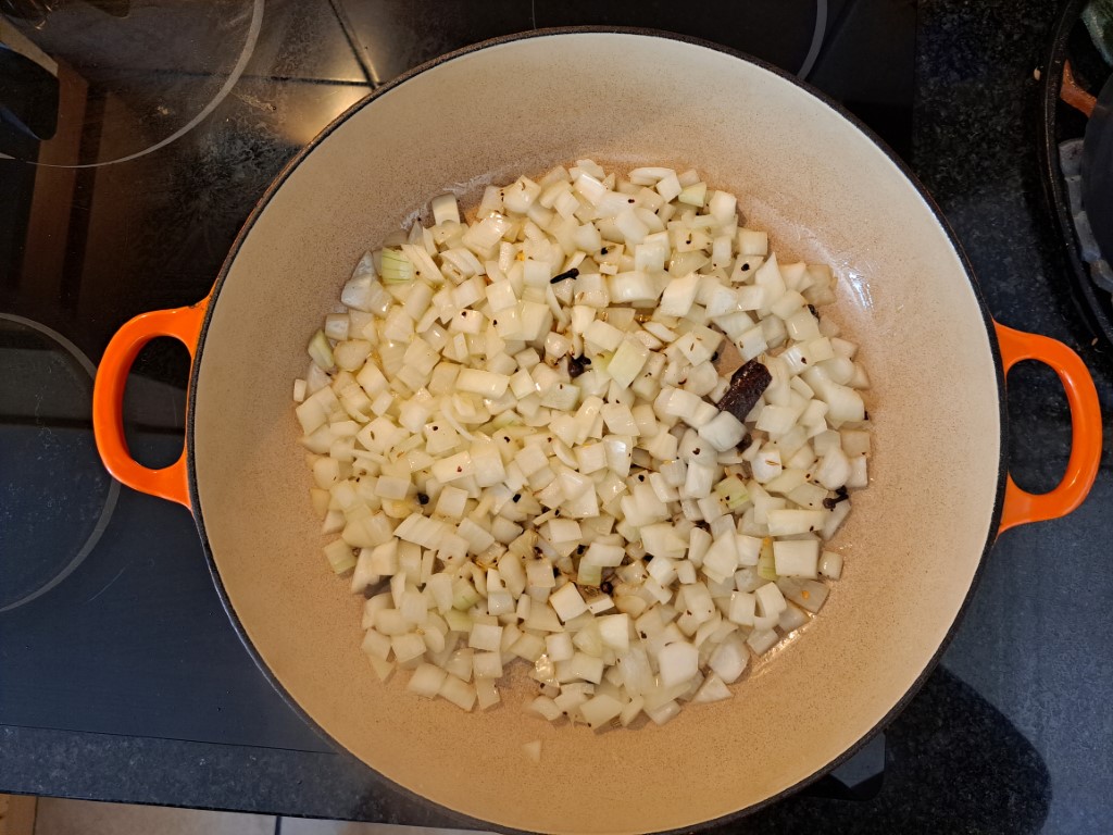 To release the flavours of the spices, first fry them for a while in a little olive oil. The aromas reminded me a bit of Christmas and New Year at the same time – just what you want to smell in your kitchen at this time of year!