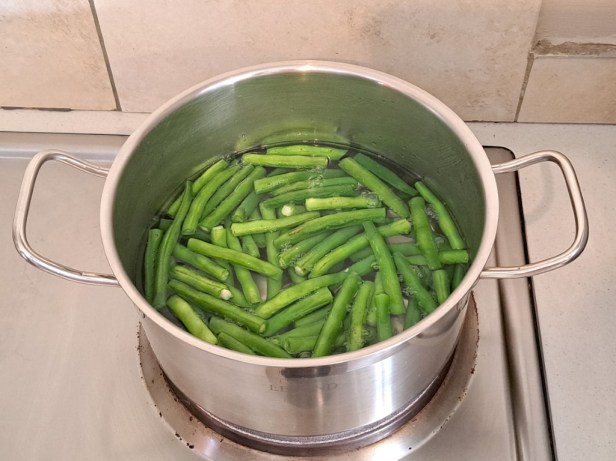 Bring the water to a boil in a pot on the stove to which a pinch of salt has been added. When the water starts to boil, add the green beans. Let it boil for about 5-7 minutes (it shouldn’t be mushy, but still nice and firm). Remove from the pot and strain them through a colander.