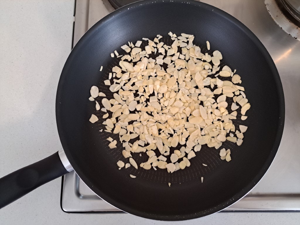 You can of course buy toasted almonds in the store – raw almonds can be a little bland. But if you only have raw almonds (like we did), put them in a pan and toast them dry by moving the pan from side to side until the almonds are golden brown. Put them aside.