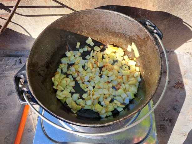 Heat oil in a saucepan (or a ‘potjie’ when camping) over medium heat. Fry the onions until just golden brown. Then add the chopped garlic and fry for another minute.