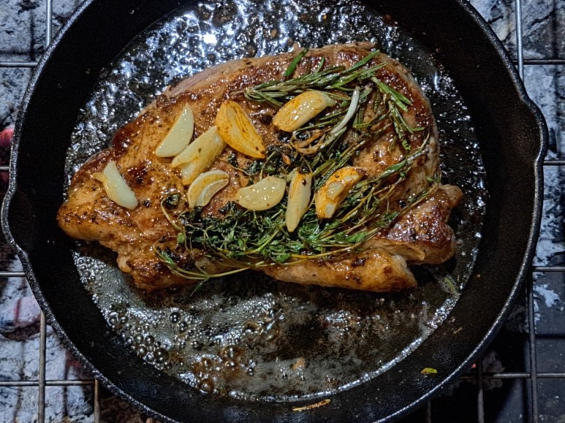 After searing the steak and turning it a couple of times, you can put the garlic and herbs for a while on top of the steak for that extra flavour.
