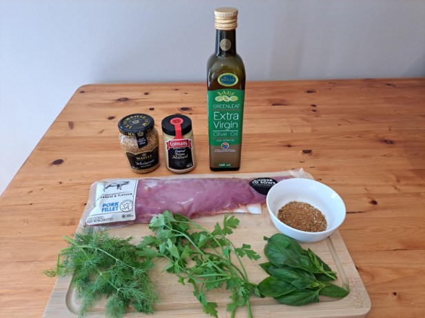Ingredients for pork tenderloin (some of the mustard sauce ingredients are in this photo as well β oops)