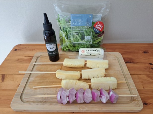 We string the pineapple and onion pieces on wooden skewers so they don’t fall through the grid into the fire. Turn it over a few times until it starts to colour, then take it off – it’s ready for the salad.