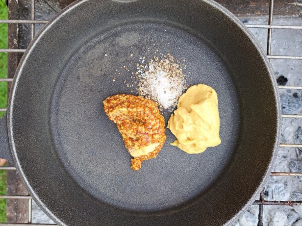 In a cast iron pan, add both mustards and salt and pepper. Add the cream and mix well.