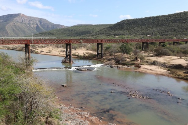 While we were taking photos of the Great Kei Bridge, we saw another bridge further upstream. We later read in archive documents that the first wooden Rail Bridge was destroyed in a major flood in 1917 and that the Great Kei Bridge then served as both road and rail bridge until the new steel Rail Bridge was completed 32 years later in 1949 – the bridge we saw from the old Great Kei Bridge.
