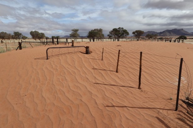 Gate and fence buried under desert sand