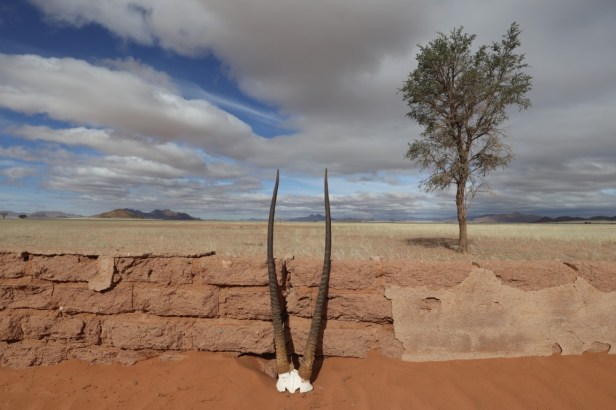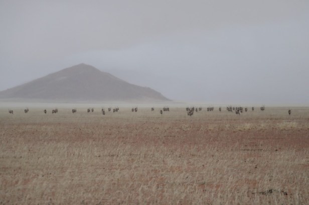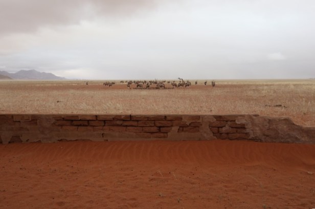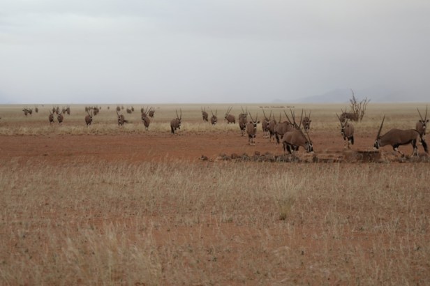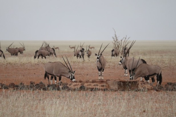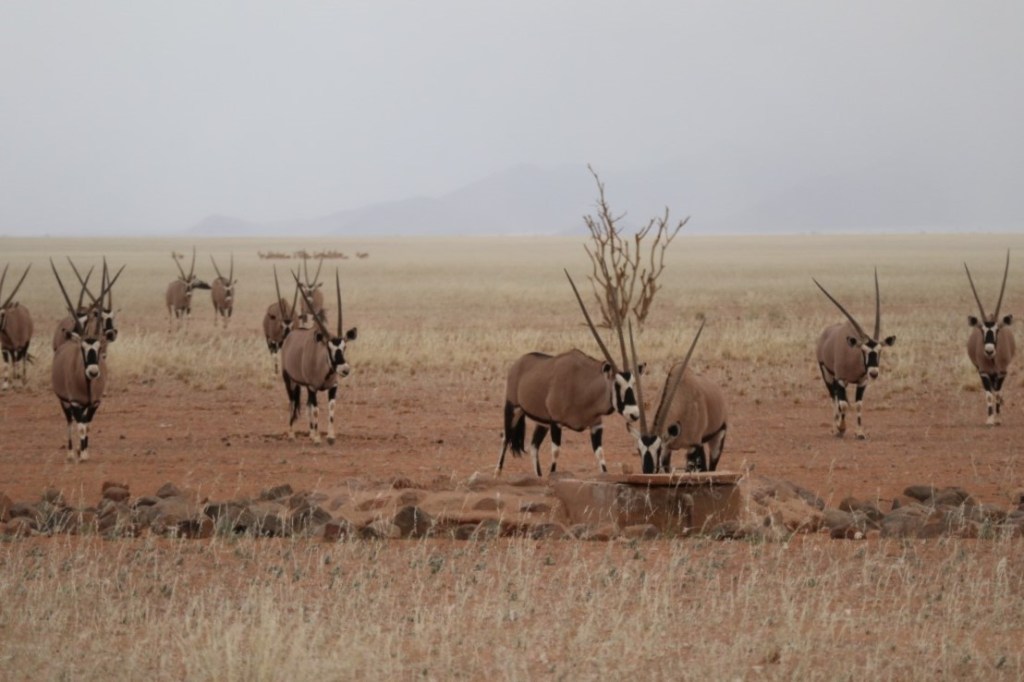 While we were sitting on the veranda, it started to drizzle and then the rain became more persistent. It was wonderful to experience this in the desert. In the distance, we saw animal silhouettes approaching through the misty rain – there is a waterhole just a few meters from the house. We were amazed when a herd of nearly fifty oryx (‘gemsbok’) came to stand almost right in front of us to drink water.