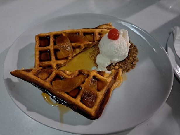 Belgian Waffle with baked apple, nuts, cinnamon and ice-cream as dessert