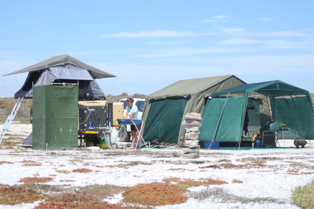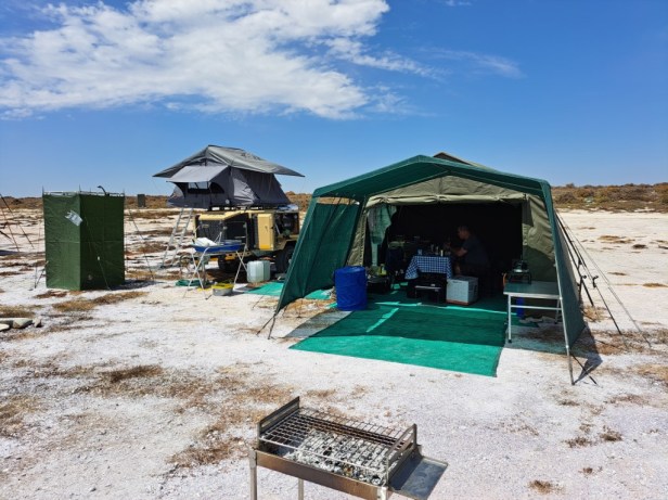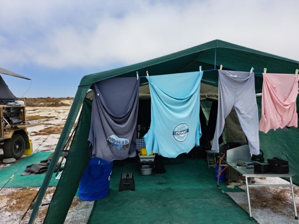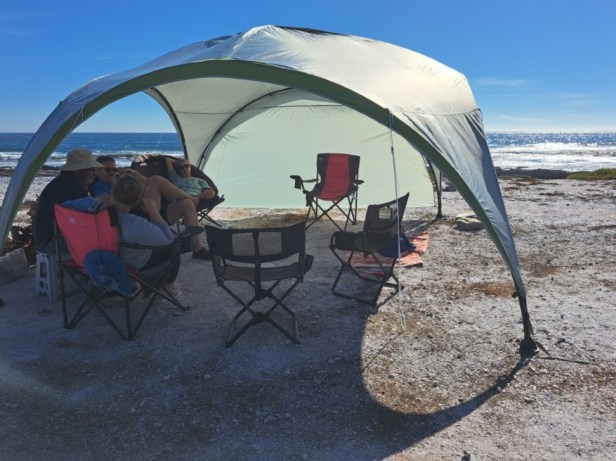 We also brought our diner tent again (the same one we used a year ago at our three-week camp at Yellow Sands near East London). This tent was our dining room/dressing room/kitchen/lounge. At the front of our diner tent, we set up a gazebo that provided extra shade.