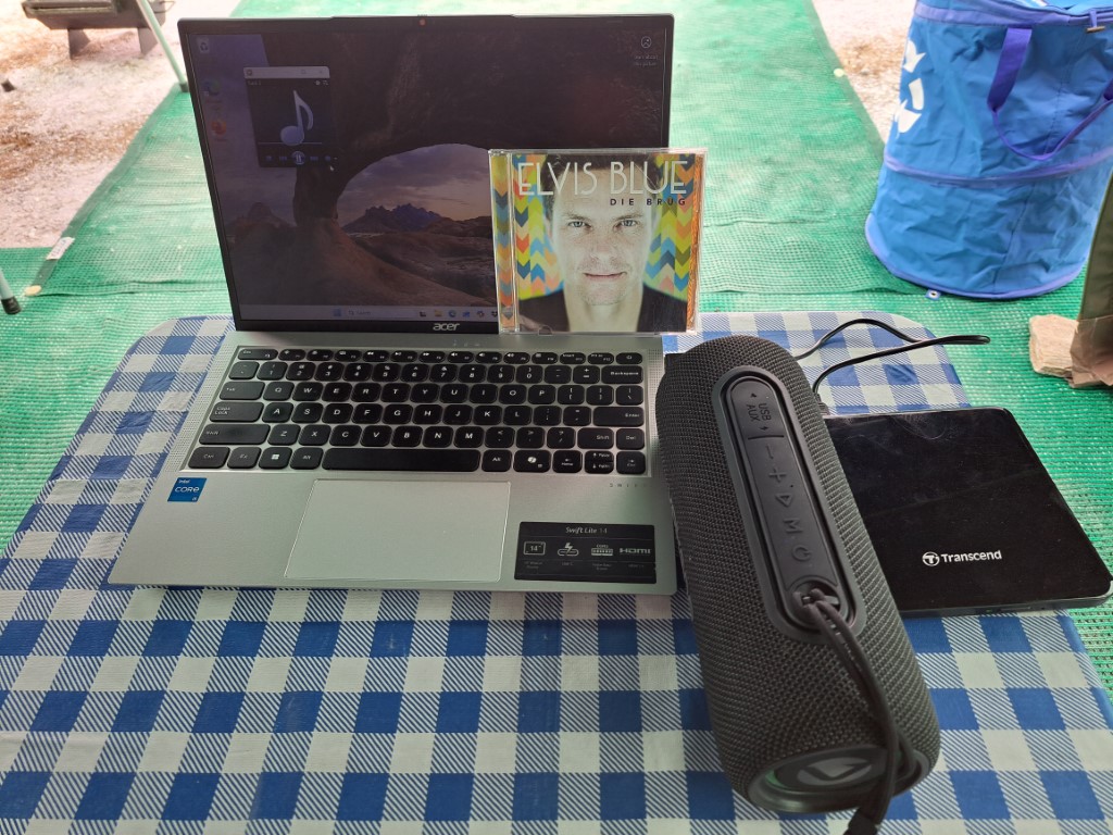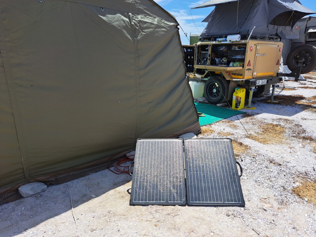 Wild camping normally means no electricity. We had two camping fridges (one for freezing and the other for keeping food cold). Solar panels and batteries are the solution to make sure that meat stays frozen – and beer cold. Berto placed one solar panel (120W) on the external battery to keep the freezer in our diner tent cold, and another solar panel (240W) connected to the camping trailer’s battery for the other fridge. This battery charged lights, as well as our laptops (I will explain later in this post why we used our laptops).