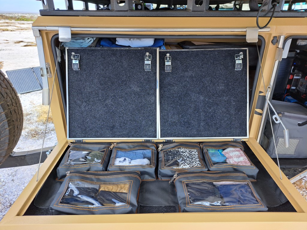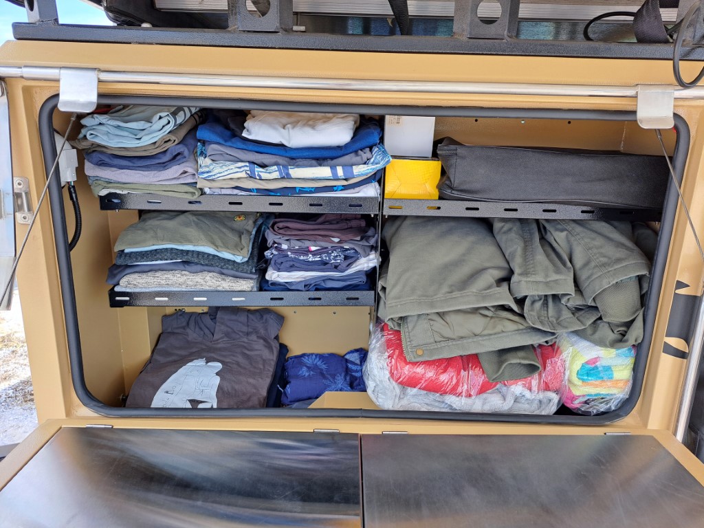 While we’re talking about laundry, there’s something else I want to share with you. Our camping trailer has a compartment with shelves and pouches. This is usually where I store bedding and rechargeable lights when we go on weekend trips, but on our two-week-long camp, this area worked perfectly as a wardrobe.