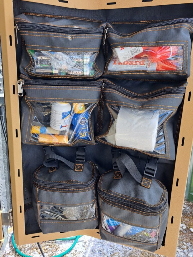 There is also a door with pouches where we can store sunscreen lotion, mosquito repellent, toilet paper, and batteries. And I love our ‘His and Hers’ toiletry bags that can easily be clipped off to take with us to the shower.