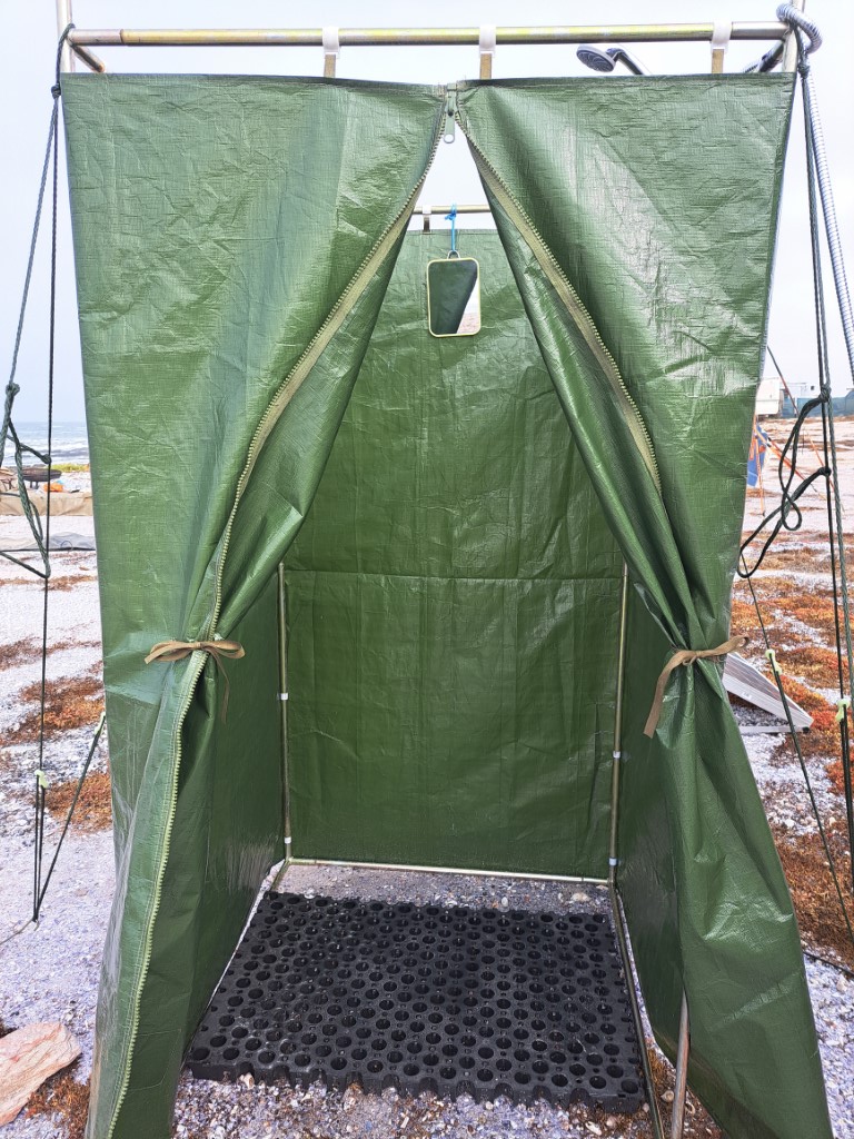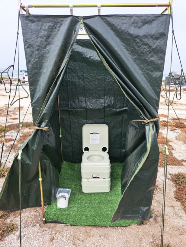 Now, the toilet is perhaps the one aspect that can scare off prospective wild campers. We placed our portable toilet (also known as a ‘porta potty’) a distance away from our campsite in a tent similar to the shower tent. Berto even bought artificial grass on which he placed our toilet – this can be seen as a luxurious touch, right?