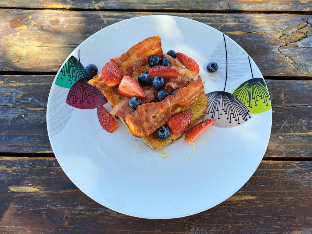 Since we had only had rusks before going for a walk, we made French toast with crispy bacon, fruit, and honey for a late breakfast and enjoyed it under the tree next to our cottage.